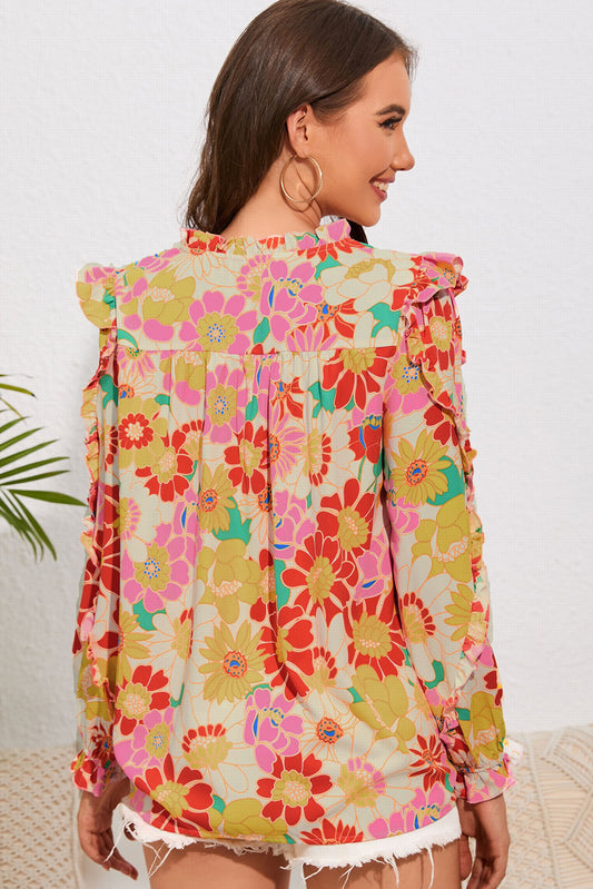 Double Take Floral Tie Neck Ruffled Blouse