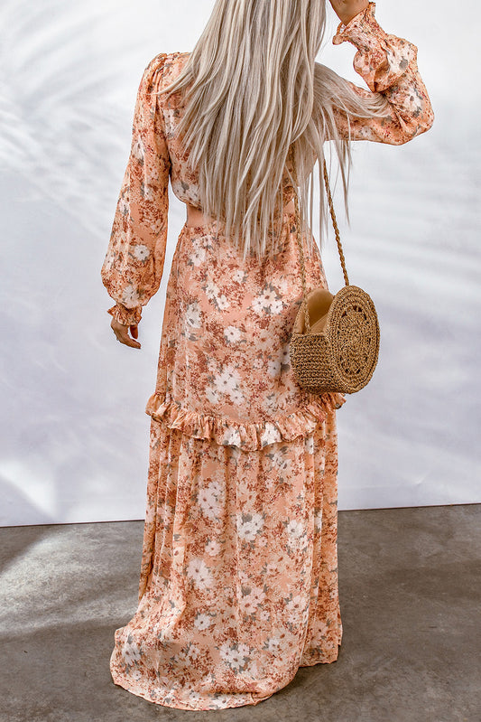 Floral Cutout Frill Trim Flounce Sleeve Dress