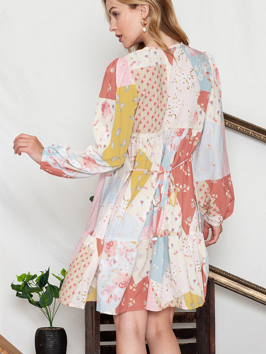 Printed Tie-Waist Keyhole Ruffle Hem Dress