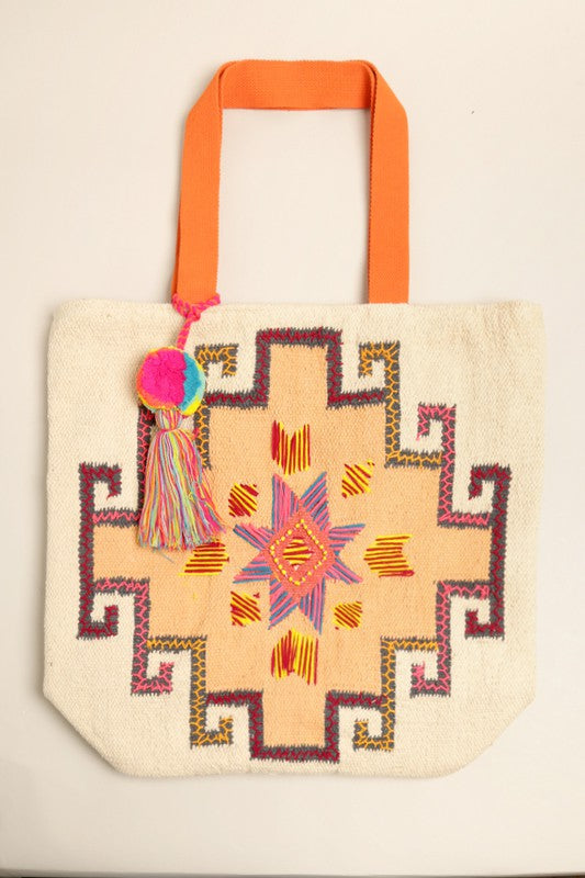 Aztec Pattern Pom Pom Tassel Shoulder Bag